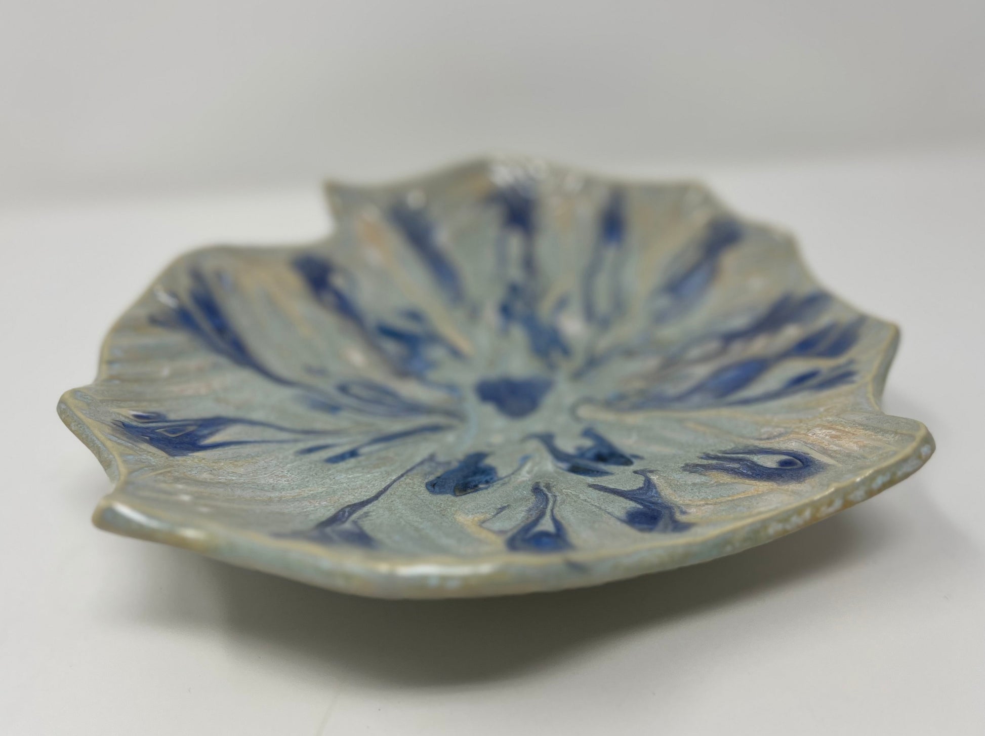 This hand-built footed display dish brings a gentle, icy elegance to any room. Soft frost-blue glazes swirl and drift across the surface, pulled inward toward the center in natural flowing patterns. Deep indigo accents bloom like ink in water, creating movement and dimension across every ridge and fold of the sculpted form.