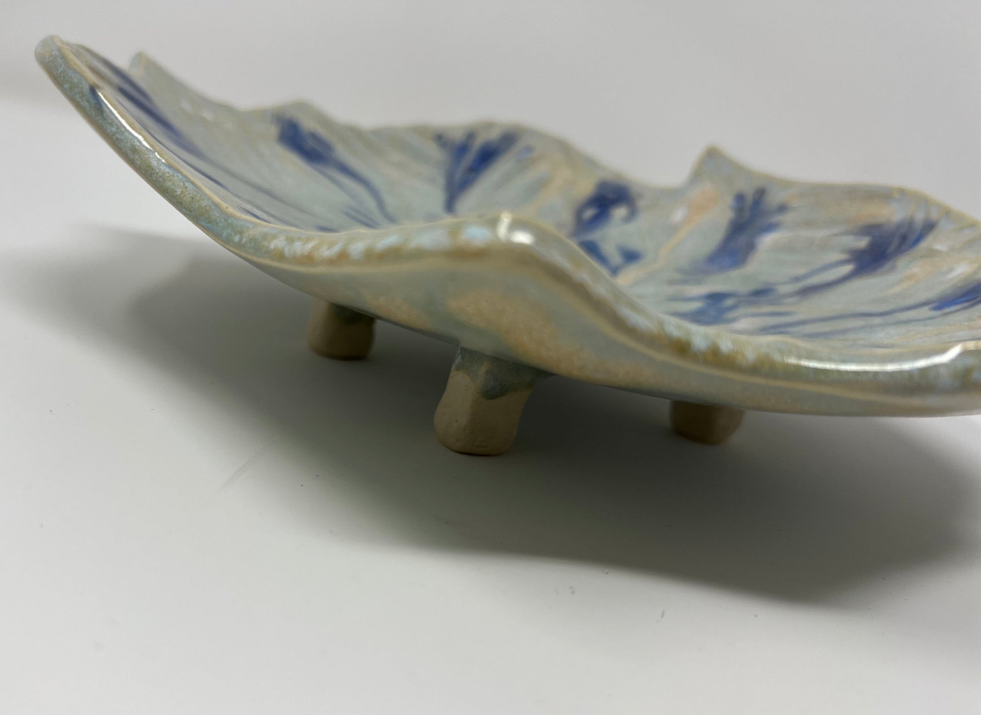 The dish stands on four hand-formed feet, giving it lift, presence, and a gallery-style presentation. The underside features a smooth, glossy pale blue glaze with warm beige breaks along the edge and your impressed maker’s mark — a subtle signature of its handmade origin.