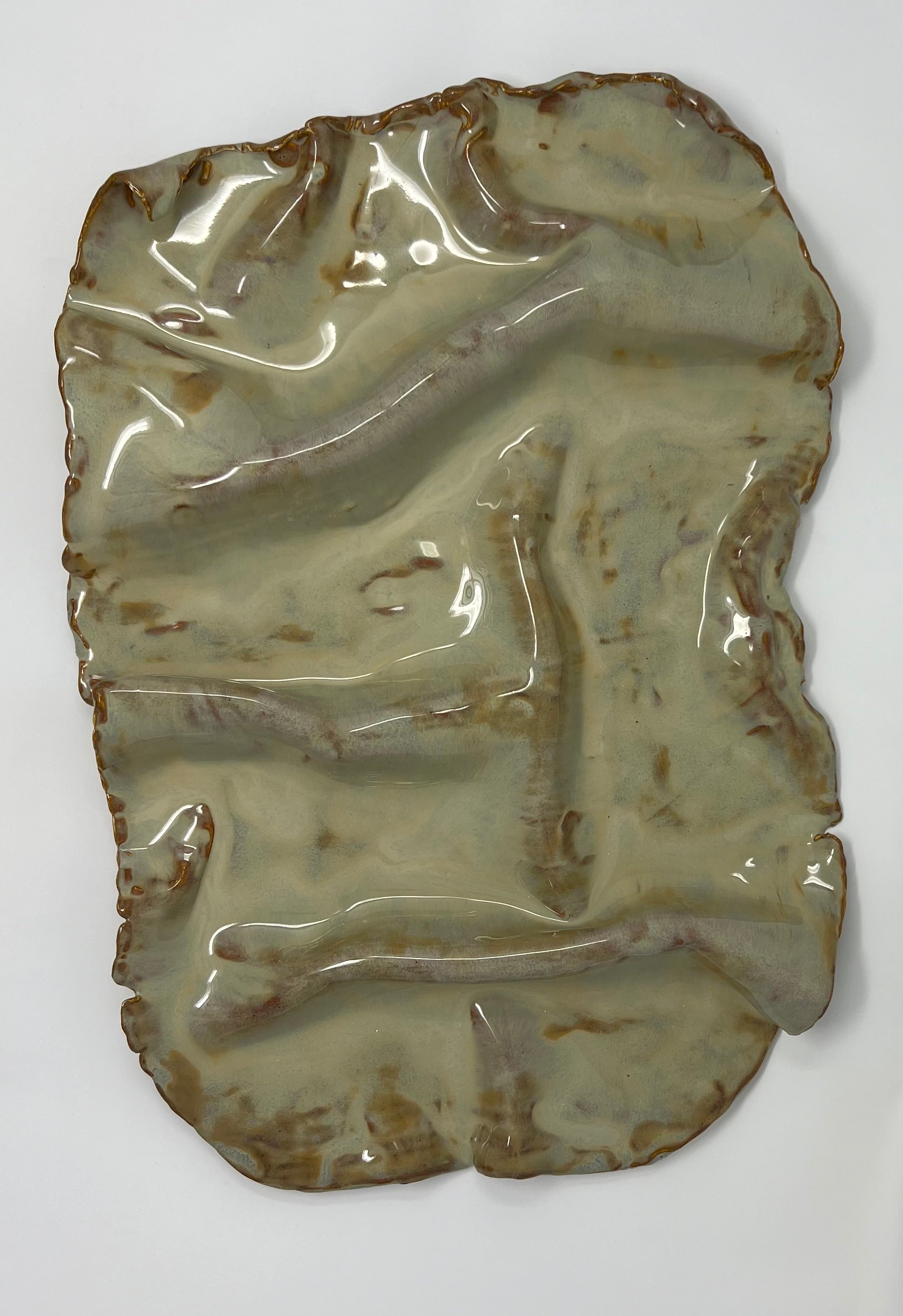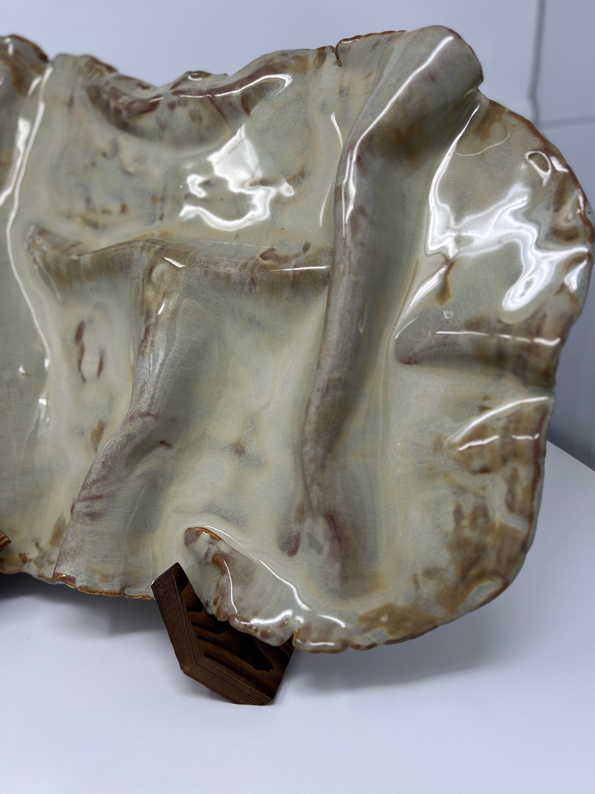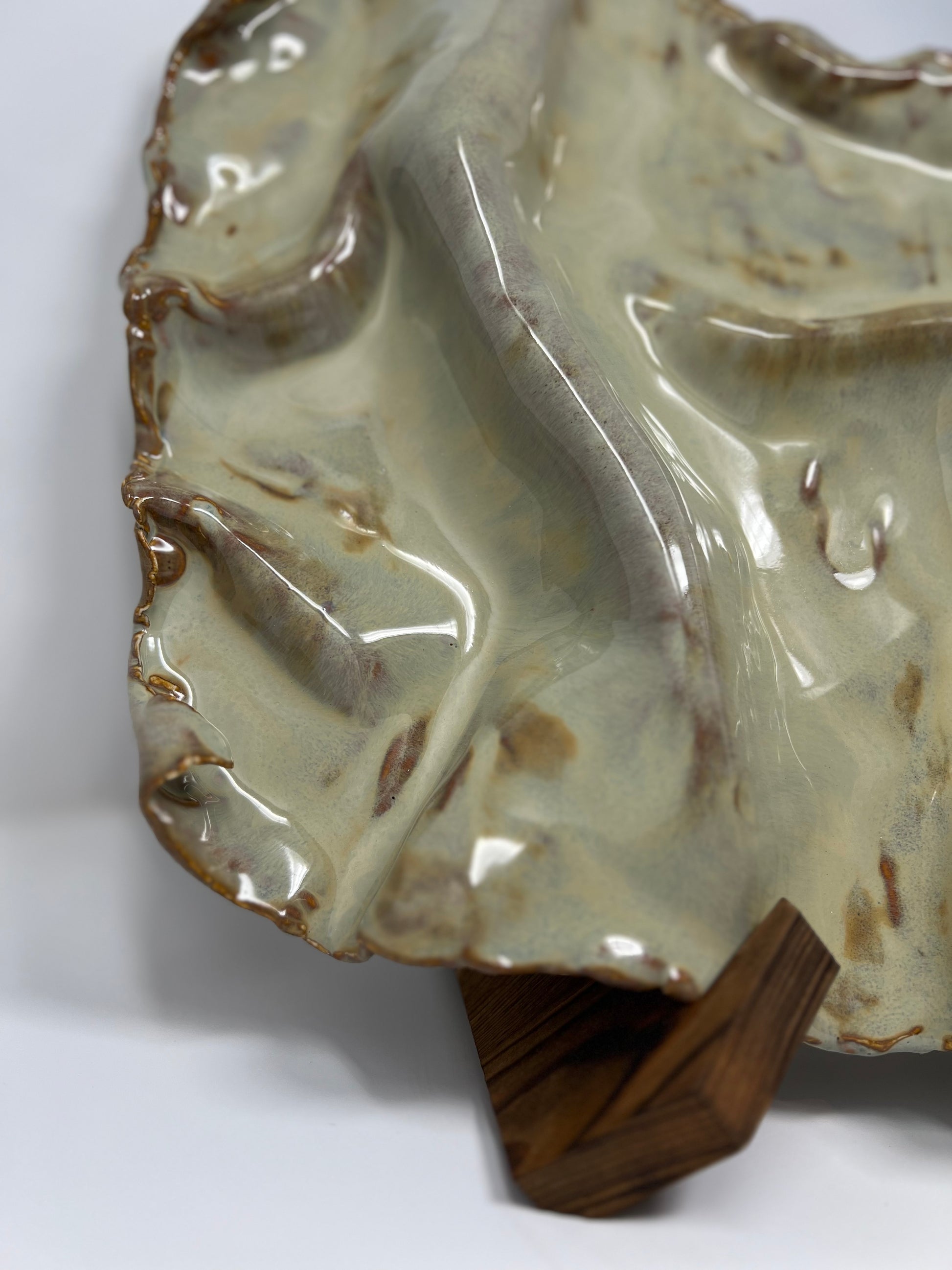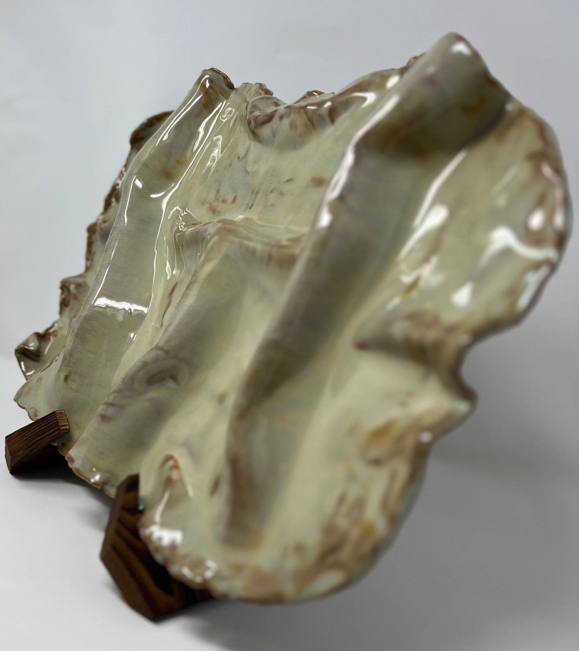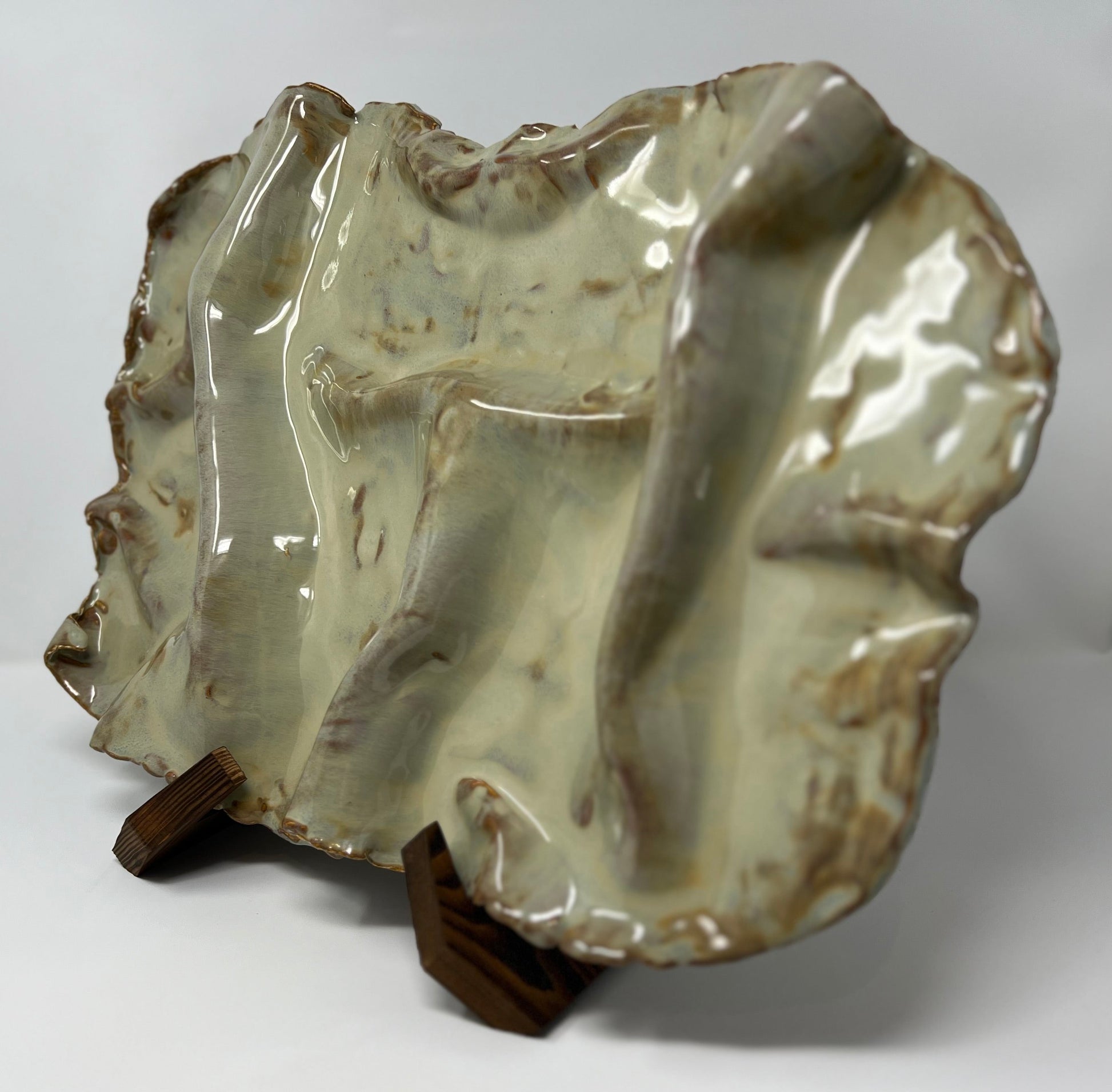 “The Essence of Fabric” is a one-of-a-kind sculpted ceramic platter that captures the soft folds of draped cloth in solid clay. Each ridge and valley was hand-built and carved, then finished with a flowing Mayco Opal Luster glaze that pools in the curves and highlights the subtle texture beneath.