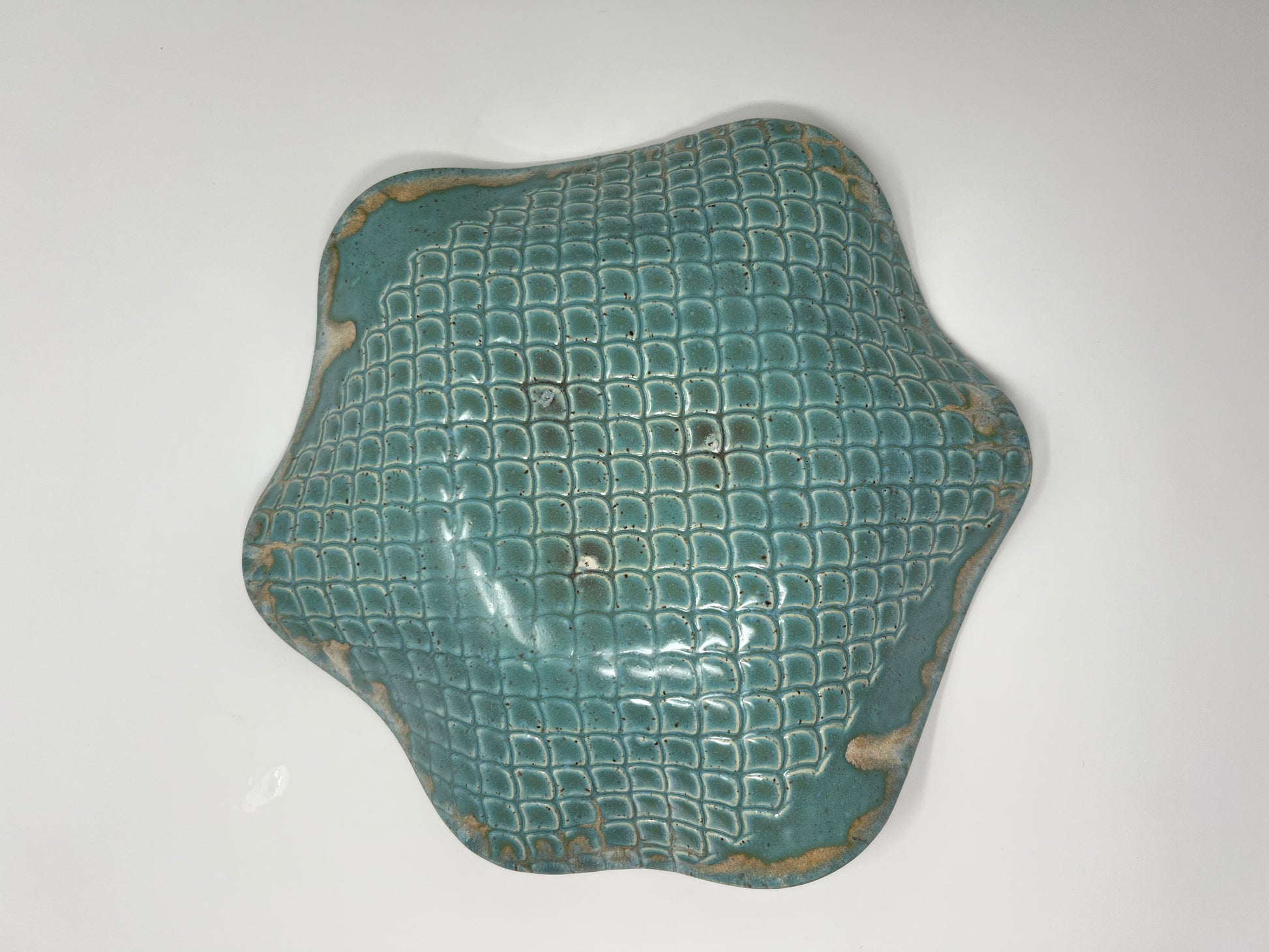 The rim lifts and falls in a gentle 3½–4 inch wave, making the bowl sculptural from every angle. The underside is fully glazed in a pressed grid texture, so the piece is just as beautiful when lifted, displayed on a stand, or viewed on a shelf.