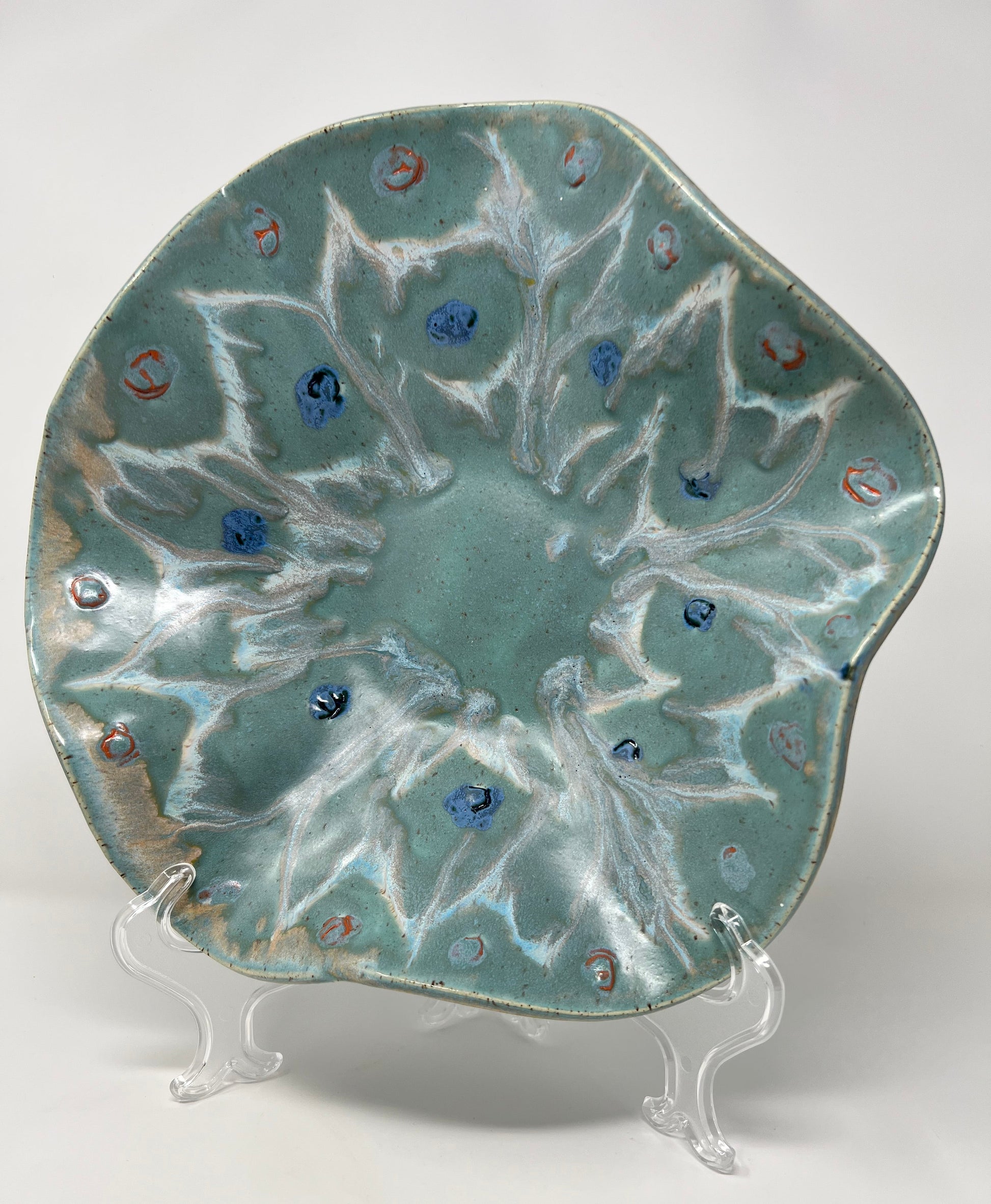 This large hand-built wavy bowl from our Coastal Drift series brings soft shoreline colors into your home. Ocean-green and sea-glass aqua glazes pool and flow toward the center, while sandy beige and warm toast tones melt through the surface, echoing waves washing over wet stone. Raised glaze accents create small textured “drops” around the inner band, giving the piece subtle depth and movement.