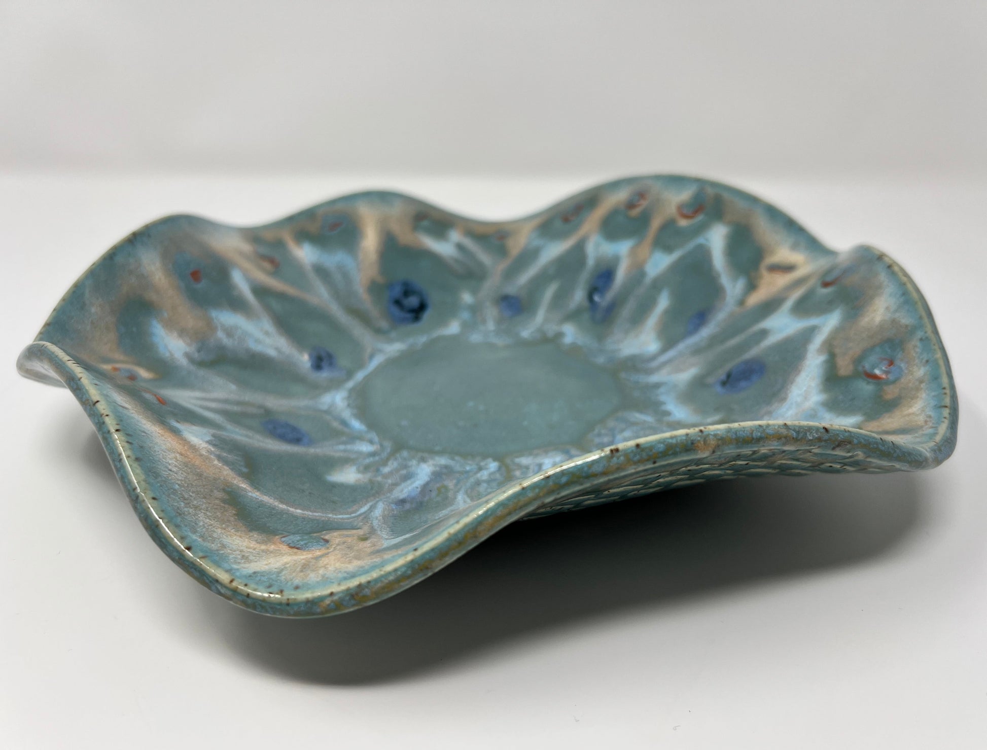 This small hand-built wavy bowl from our Coastal Drift series brings soft shoreline colors into your home in a compact, display-ready size. Layers of ocean-green, sea-glass aqua, and warm toast-beige melt and drift toward the center, echoing the way water pulls across stone. Raised glaze accents create subtle textured “drops” around the inner band, adding movement and depth in the same flowing style as the larger Coastal Drift bowl.
