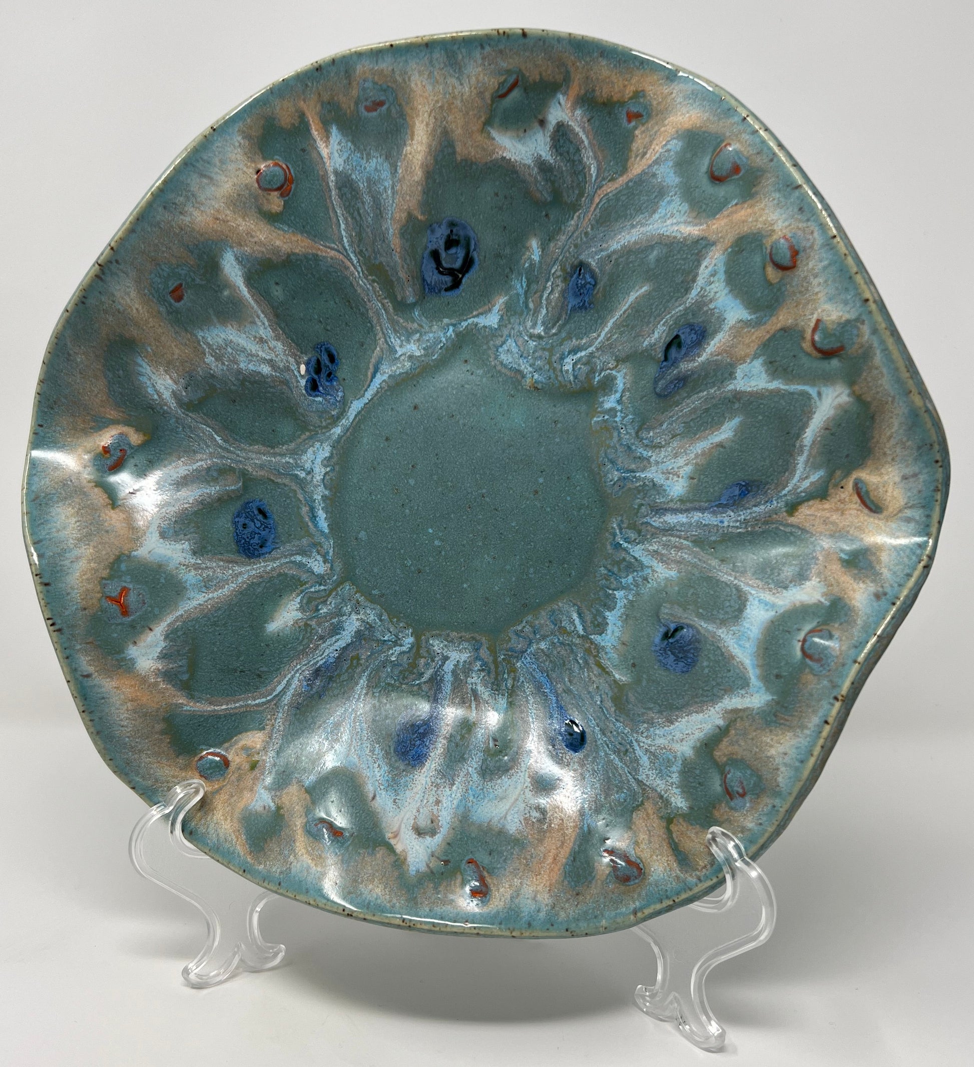 Measuring approximately 10 inches in diameter, this smaller wavy bowl is well-suited as an accent dish, entryway catch-all, jewelry or key bowl, or a small coffee-table centerpiece. Hand-built stoneware, fired to a durable temperature and finished with food-safe glazes.