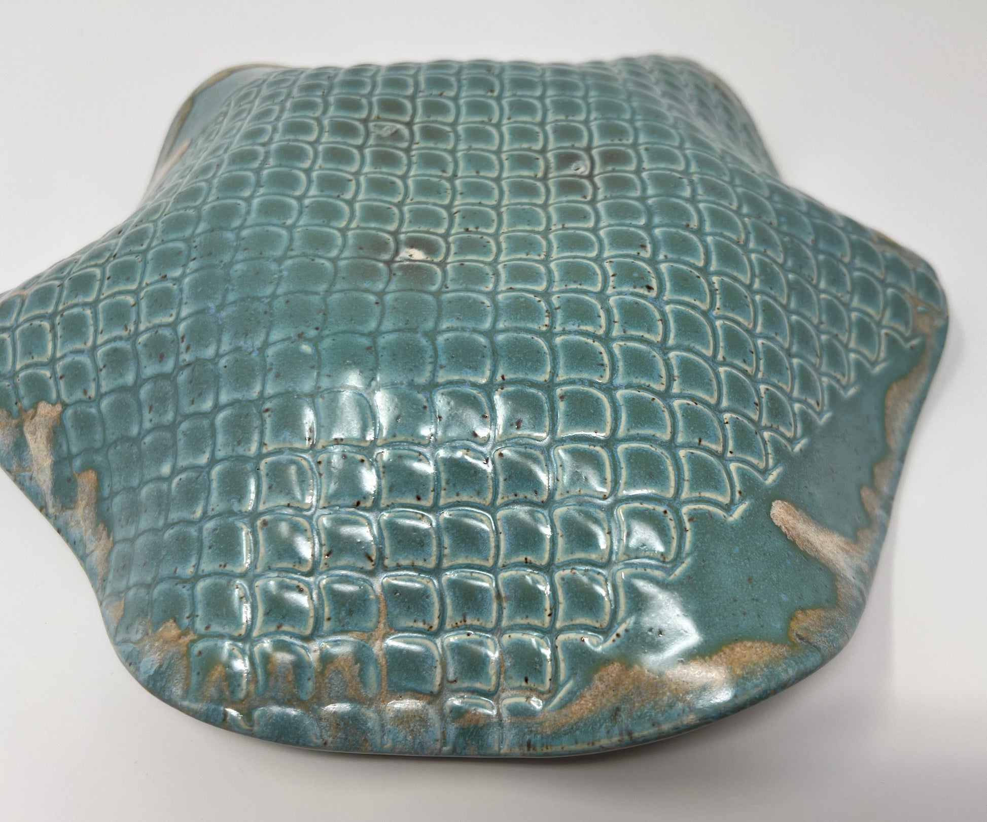The rim lifts and falls in a gentle wave, giving the bowl a sculptural, organic presence from every angle. The underside is fully glazed in a pressed grid texture—rich, tactile, and inviting—so the piece remains visually striking whether displayed upright, set on a stand, or resting naturally on a shelf.